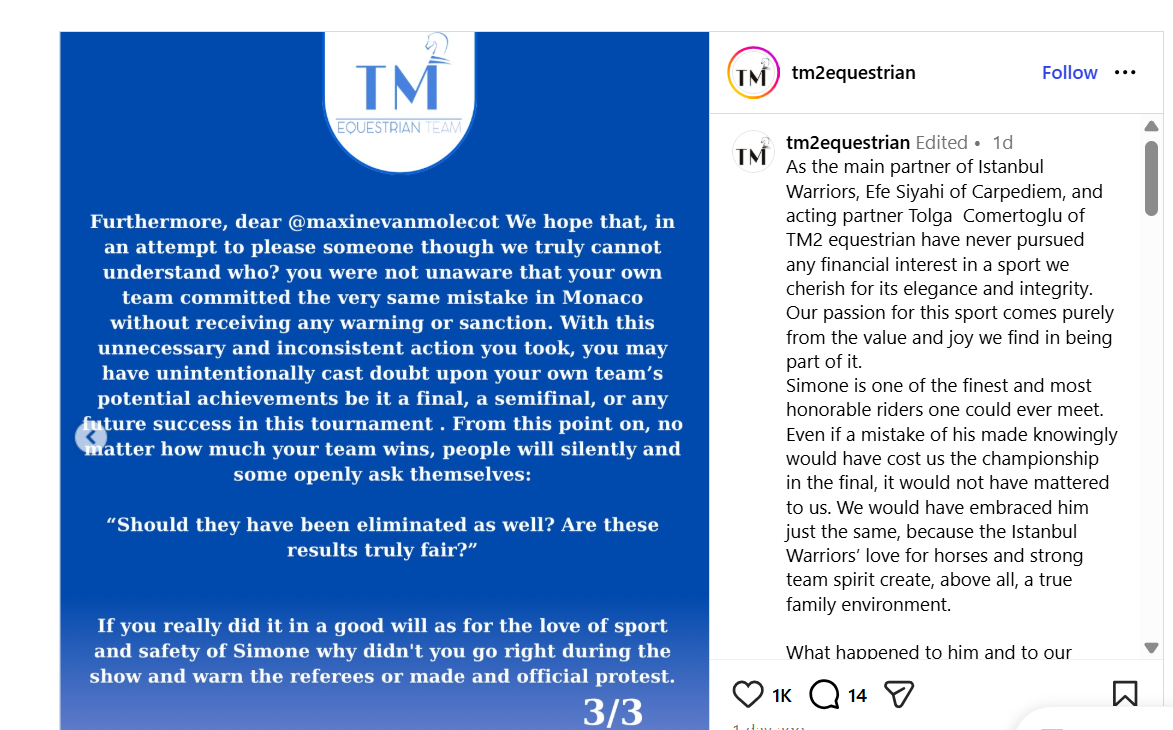 According to this Instagram post by TM2 Equestrian, a partner of the Istanbul Warriors, Maxine van Molecot the Communication Officer of the Iron Dames team, was the one who informed the Jury. See here