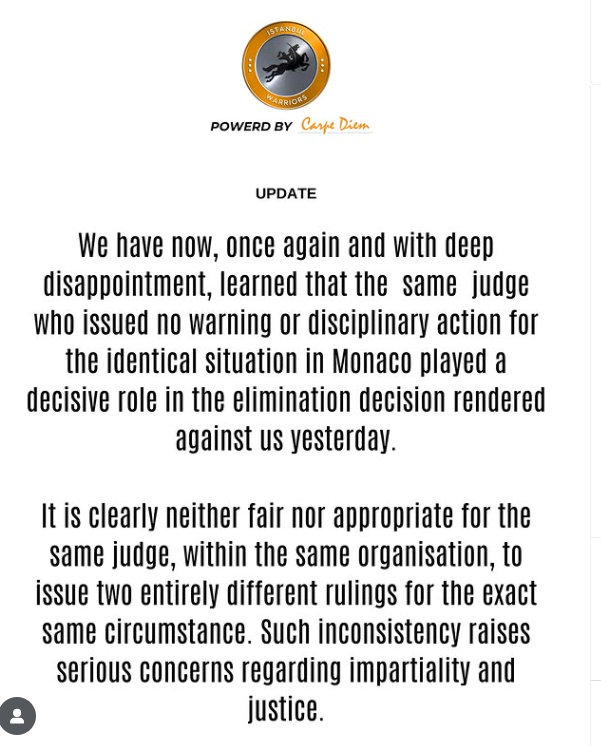 Their filing stated that the very same judge who applied this disciplinary action had not acted in the same manner when the identical incident occurred during the LGCT Monaco leg, implying a grievous double standard.